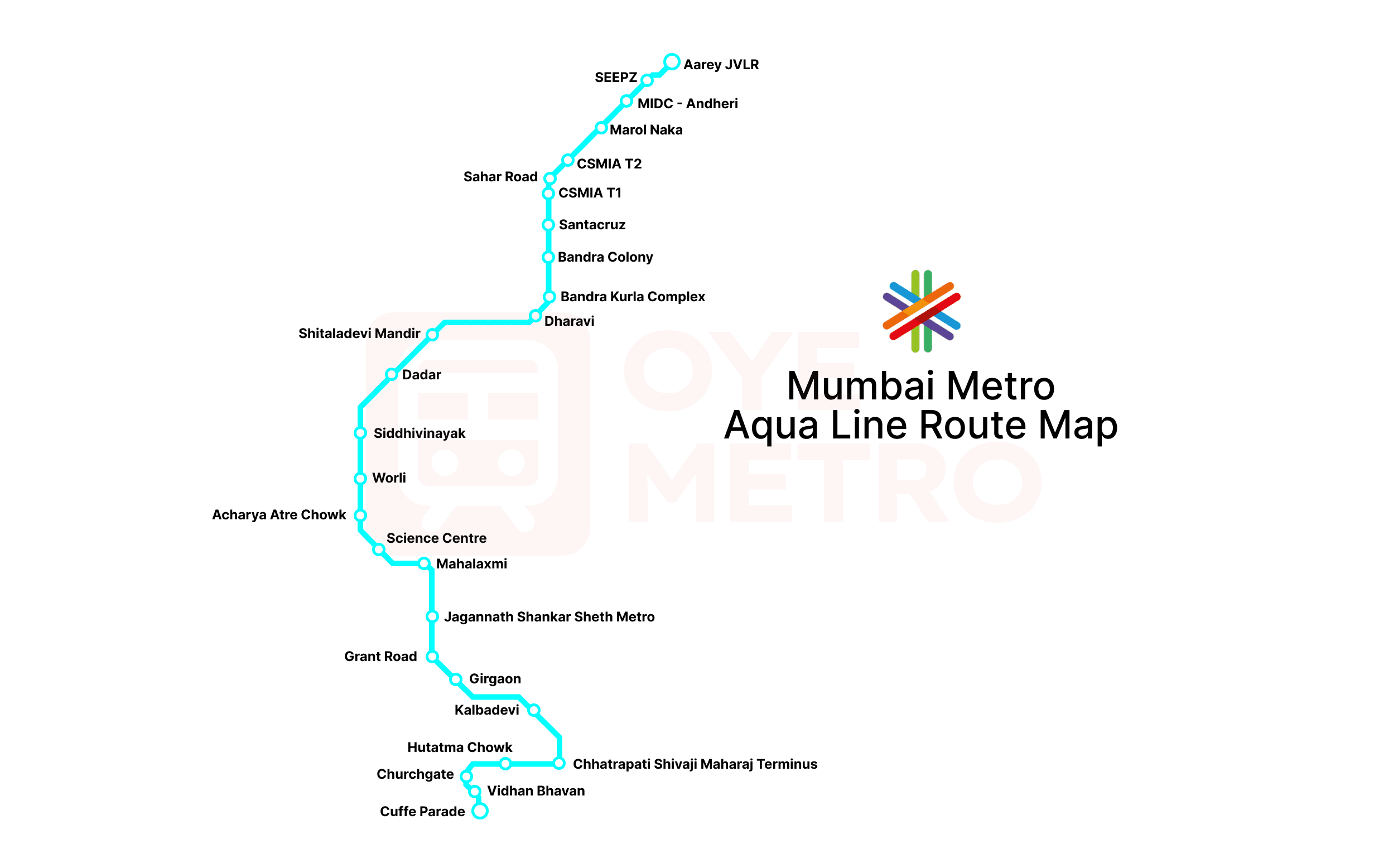 The Aqua Line is a metro line of the mumbai metro, a rapid transit system in Mumbai, India. It consists of 27 active stations of all mumbai metro network and operated by Mumbai Metro Rail Corporation (MMRC). Explore mumbai metro Aqua Line route details like stations list, route map, interchange, fares, time and distance between source and destination, and top attractions nearby etc.